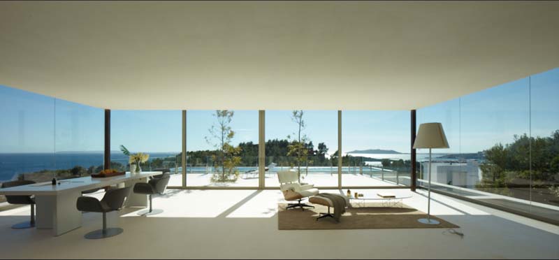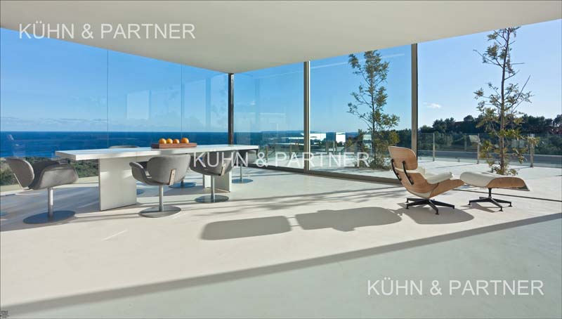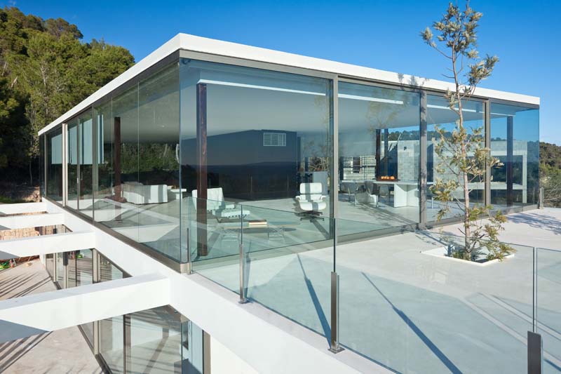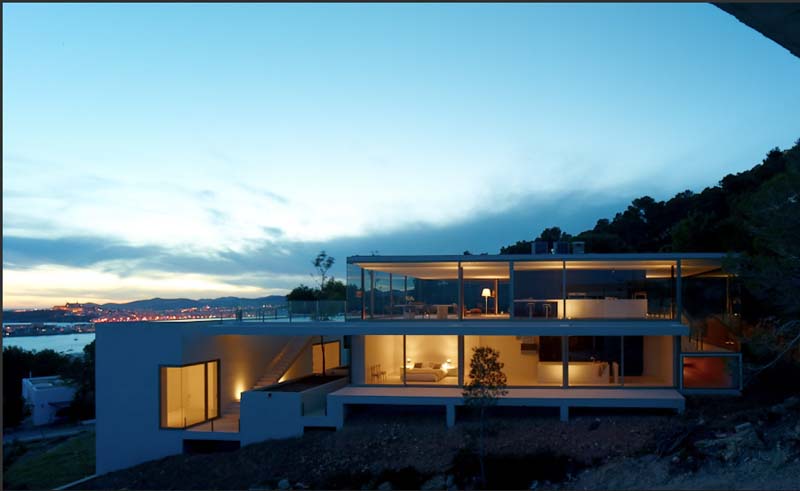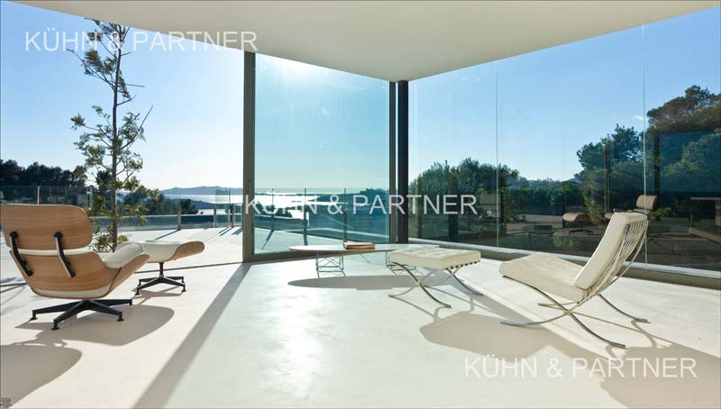 This villa is the height of luxurious contemporary living; ultra-minimal and super stylish – designed by world renowned architect Bruno Erpicum. He’s taken full advantage of the superb views of the old town and the sea by creating a house that appears to be made of glass. There are four bedrooms within the house and a separate apartment which can be turned into two more bedrooms or stand fully independent. The property boats a huge 170 m2 living room, plus state of the art Baltaub kitchen including wine fridge etc. All bedrooms are en suite and have bespoke wardrobes, under-floor heating and AC throughout. The terrace leads to an 18 meter infinity pool with ample space for lounging. The house is perfectly located in the sophisticated Cap Martinet area, and is only 5 minutes from Marina Botafoch and Ibiza Town.