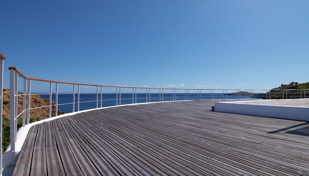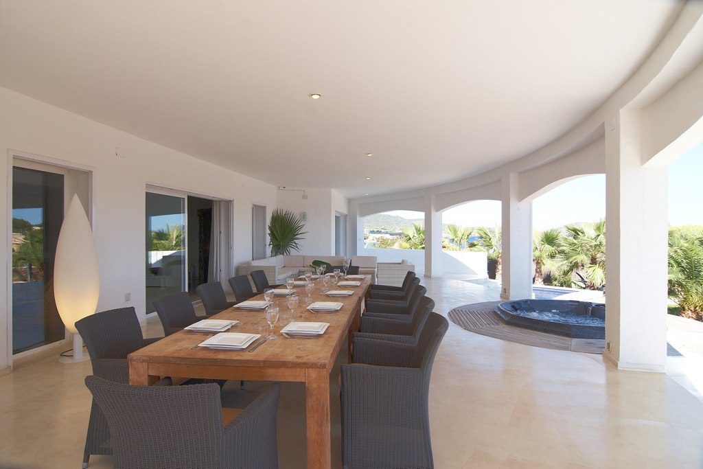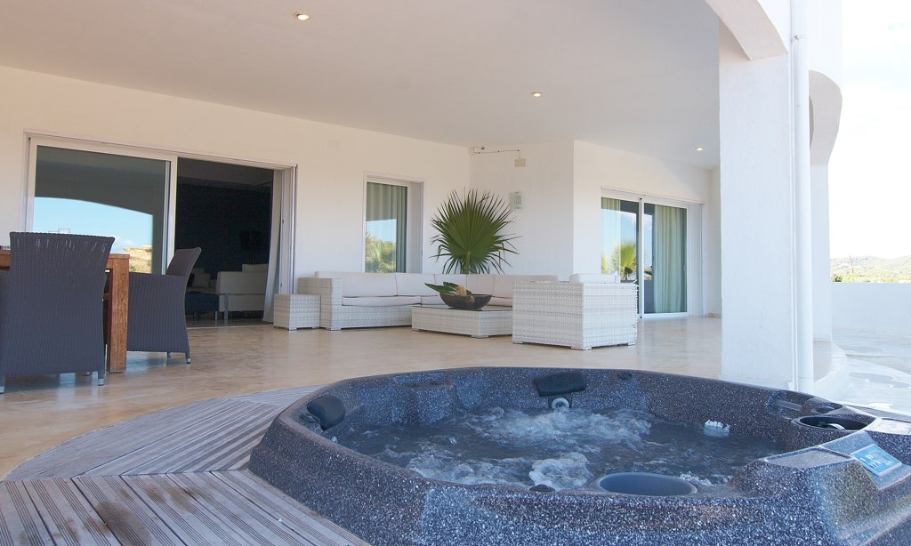 On the “sea side” of the property, there is a large covered terrace with dining area and a Jacuzzi overlooking the Mediterranean. There is a swimming pool to the side of the villa with as view to the sea.